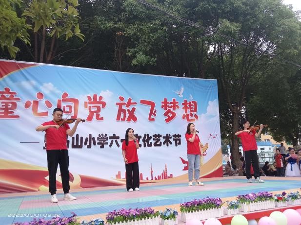音乐系邹敏老师则带领4名员工,来到荆州区马山镇马山小学参加“童心向党,放飞梦想”六一文化节。优美嘹亮的歌声伴着小提琴悠扬的旋律,沁入小朋友心田,让他们感受到了音乐与器乐相碰撞的回响。