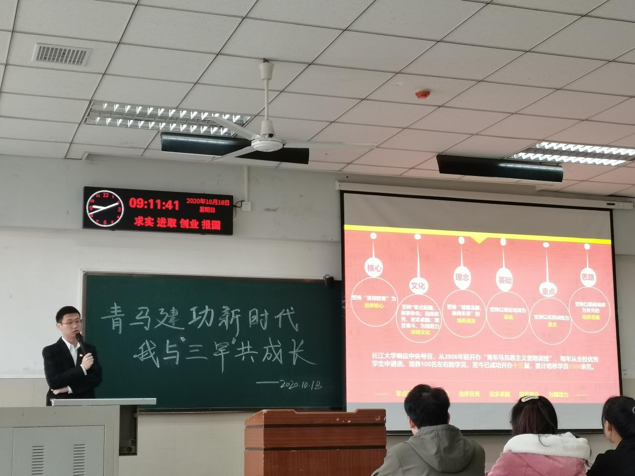 为了助力学风建设营造“三早”风尚,进一步引导广大团员青年坚定中国特色社会主义道路的理想信念,成长为中国特色社会主义事业的合格建设者和可靠接班人,青年马克思主义者培训班于2020年10月18日在bevitor伟德国际1946十二教102教室举办宣讲活动。活动由田承毅学长和孙安冉学姐主持,此次活动以“青马建功新时代,我与“三早”共成长”为主题,为在座的各位19级的学子通过分享在青马班的成长经历解答什么是青马班等问题。