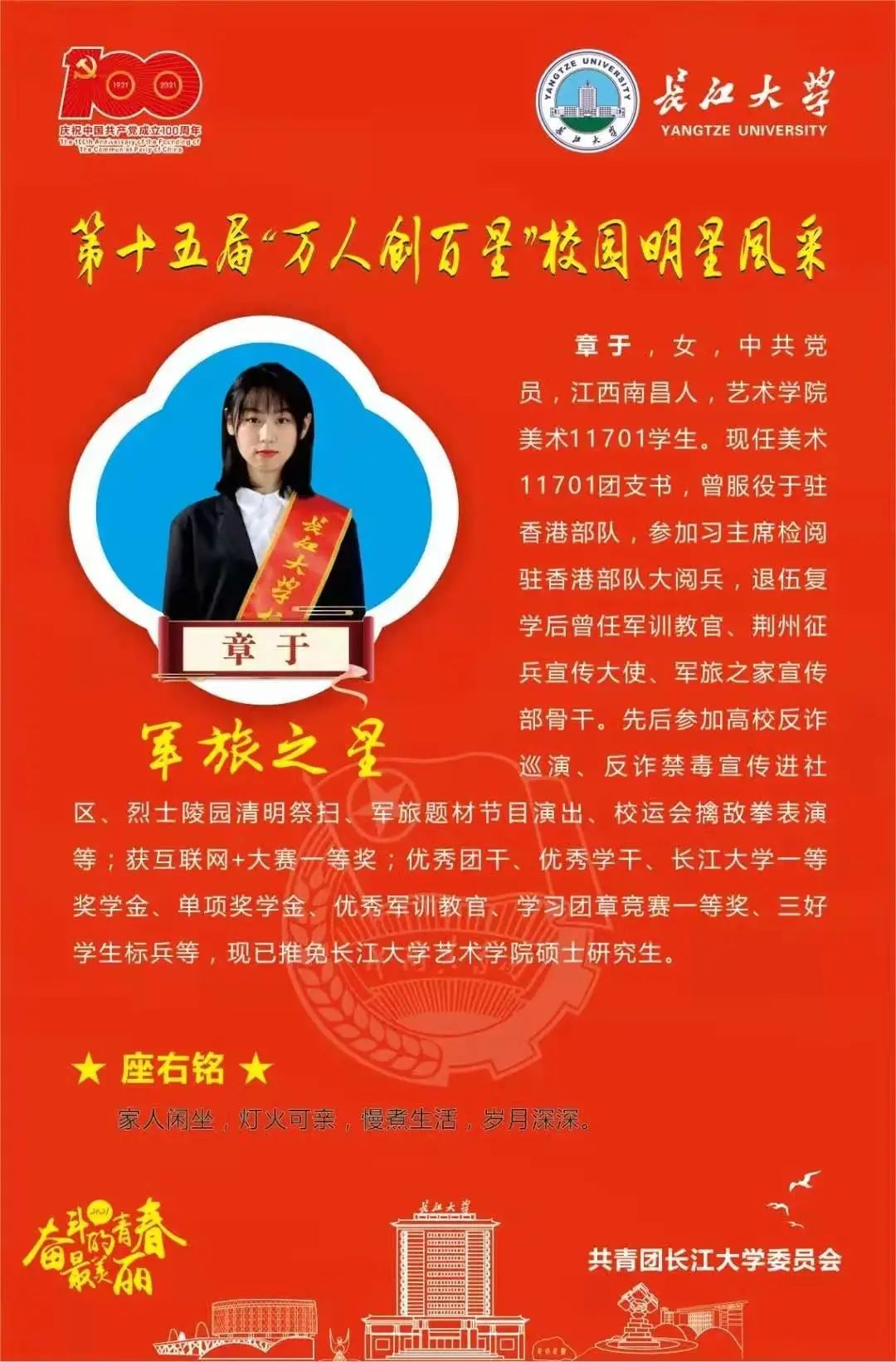 bevitor伟德国际1946在本次“万人创百星”活动中共有5人入选,分别是颜峰、章于、周小乐、任庚阳、唐子龙。经过层层选拔、角逐,最终,颜峰被评为舞台表演之星,章于被评为军旅之星,周小乐被评为美术之星,任庚阳被评为美术之星,唐子龙被评为学习之星。被评为舞台表演之星的颜峰说:“愿你成为自己喜欢的模样,不抱怨,不将就,有自由,有光芒”。习近平总书记曾勉励我们广大青年学子“有信念、有梦想、有奋斗、有奉献的人生,才是有意义的人生。当代青年建功立业的舞台空前广阔、梦想成真的前景空前光明,希望大家努力在实现中国梦的伟大实践中创造自己的精彩人生。”