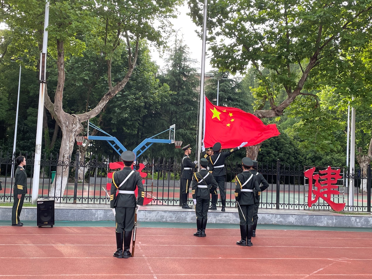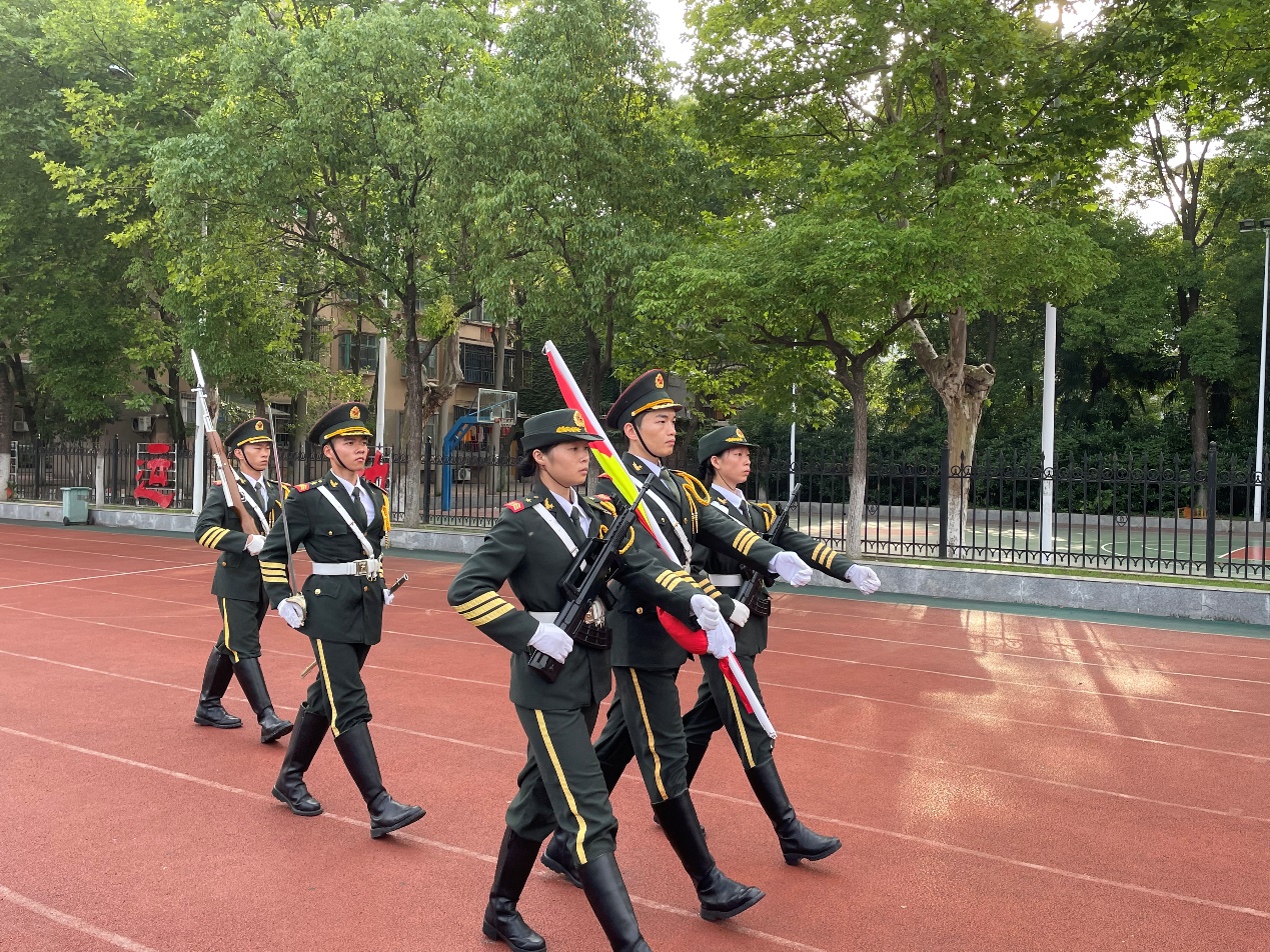 伴随着振奋人心的国歌响起,国旗护卫队踏着整齐响亮的步伐出旗,他们的庄严令人肃然起敬。全场师生齐唱国歌,向国旗行瞩目礼。