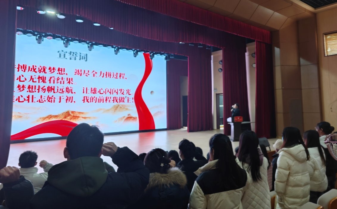 会议最后一项,全体考研学子在梅浩林老师的带领下,举起右拳,庄严宣誓:全体考生站起来,举起右手,高声宣读考研誓言:“拼搏成就梦想,竭尽全力拼过程,问心无愧看结果。让梦想扬帆远航,让雄心闪闪发光。雄心壮志始于初,我的前程我做主!”