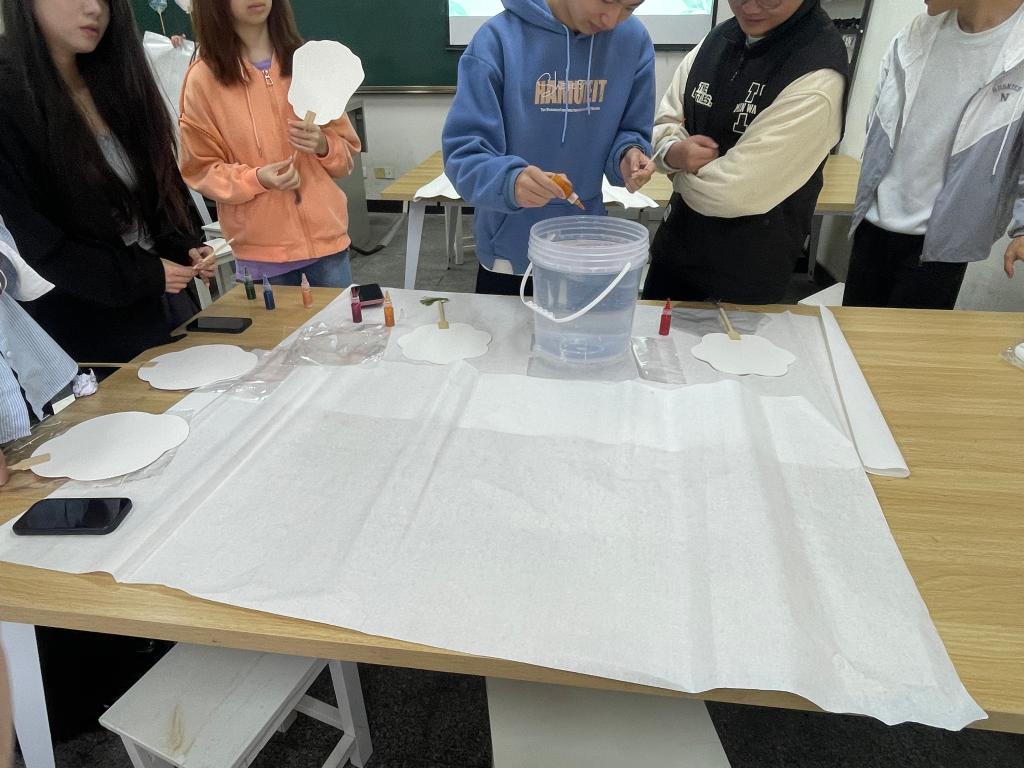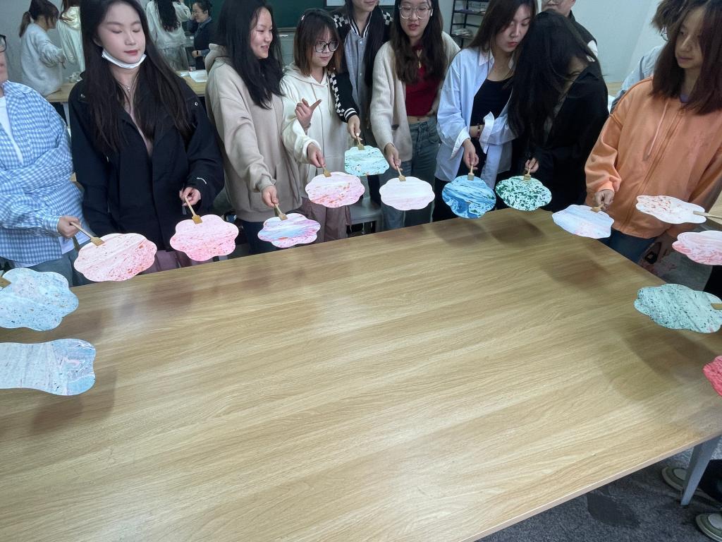 绘制过程中,同学们不仅专注于手中的漆扇,更在这一过程中感受到心灵的沉淀与放松。漆扇绘制需要耐心与专注,让大家在繁忙学业中寻得一片宁静天地,忘却外界纷扰,沉浸于艺术创作的美好。同时,同学们相互交流、分享创意与绘制技巧,彼此启发,增进了友谊与团队协作精神。