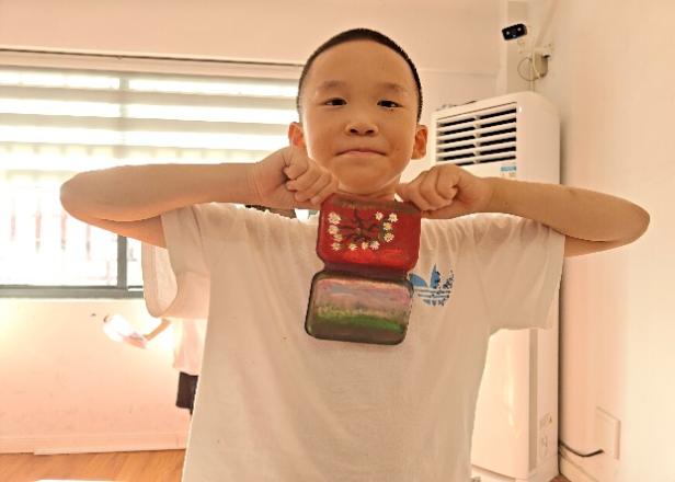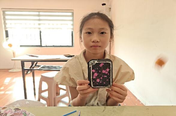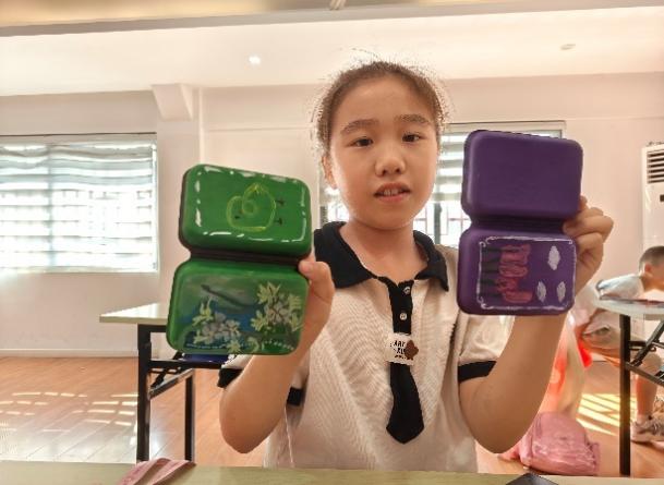 紧随其后的“漆器盒子DIY”环节,更是创意迸发的舞台。平凡的纸质包装盒,在孩子们手中经历华丽蜕变。裁剪、拼贴、涂绘、点缀亮片与金线……一系列巧思妙想之下,质朴的纸盒幻化出漆器特有的流光溢彩,成为独一无二的“漆艺”收纳盒。每一道工序都凝结着专注,每一次点缀都闪耀着创造的喜悦,古老漆艺的华彩在当代童趣中焕发新生。
