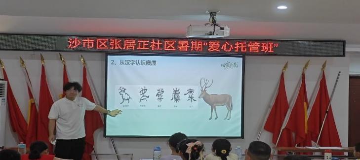 托管班开课首日,便迎来一场别开生面的学科融合盛宴。长青艺梦志愿服务队与长江老员工命科学学院同学紧密携手,共同为孩子们奉上“探秘湿地精灵——麋鹿”的科普启蒙课。生科院的“小老师”们用生动的语言和形象的展示,揭开了“四不像”麋鹿的神秘面纱——讲述其跌宕起伏的种群传奇,解析其独特奇妙的生理构造,阐释其在湿地生态中的关键角色。孩子们睁大好奇的眼睛,踊跃提问,保护珍稀物种、守护共同家园的种子悄然播撒心田。这场艺术与科学的精彩碰撞,为托管班伊始就注入了强烈的探索求知氛围。