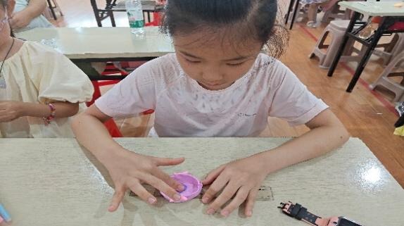 在“漆器耳杯巧手制”课堂上,志愿者们以荆州楚汉漆器为灵感,带领孩子们制作耳杯。老师先介绍耳杯“椭圆杯身+对称耳柄”的经典结构,再讲解古人“以器载礼”的设计理念。在手工环节中,孩子们运用五彩斑斓的超轻粘土,揉捏塑形、精心装饰,一件件虽稚拙却古意盎然的“漆耳杯”逐渐成型。稚嫩小手抚过模拟的器型纹路,传统工艺的智慧悄然浸润心田。