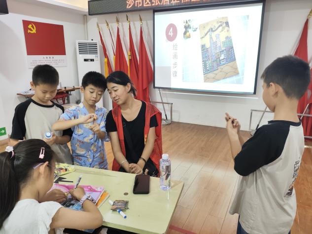 7月23日,在“城市明信片”制作课程中,志愿者们先以“你心中的城市是什么样的?”引发分享。小朋友们兴致勃勃,纷纷举手描述所爱城市的独特之处。 随后,大家在黑色卡纸上落笔,将文字化作画面:用铅笔勾勒高楼的曲线,用水彩晕染湖面的波光,用马克笔点出街角的花店。 画作完成后,小朋友们在背面写下对城市的寄语,一张张小卡片承载着对城市的热爱与想象,成为独属于每个人的“城市记忆邮戳”。