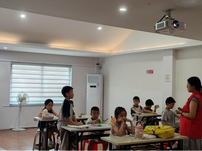 每天下午 4:00 后是“趣味加时赛”。五子棋、数字炸弹、桌面足球赛……笑声此起彼伏。游戏结束,志愿者又化身为“小老师”,一对一辅导暑期作业,解决作业难题。