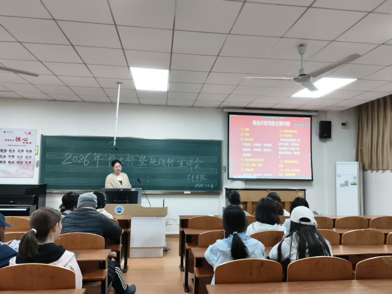 会上,杨锐老师围绕“赛事赋能成长”这一核心,详细介绍了“挑战杯”竞赛的历史沿革、赛事章程、获奖情况以及重要意义,同时对商业计划书的撰写给予了指导。她着重强调,“挑战杯”不仅是展现高校育人成果的重要窗口,更是培养员工创新精神、实践能力与团队协作能力的平台。她希望同学们能够把握机会,勇于挑战。