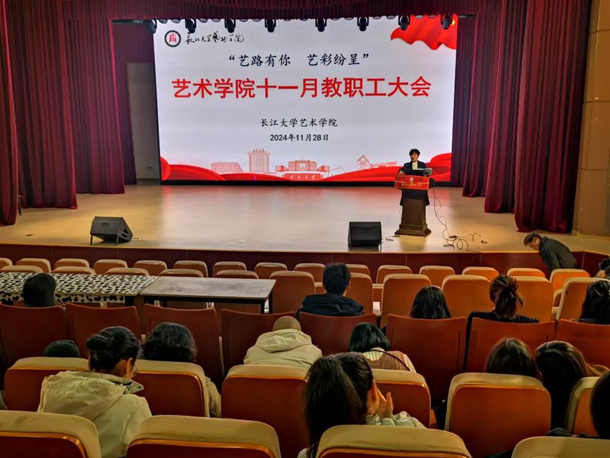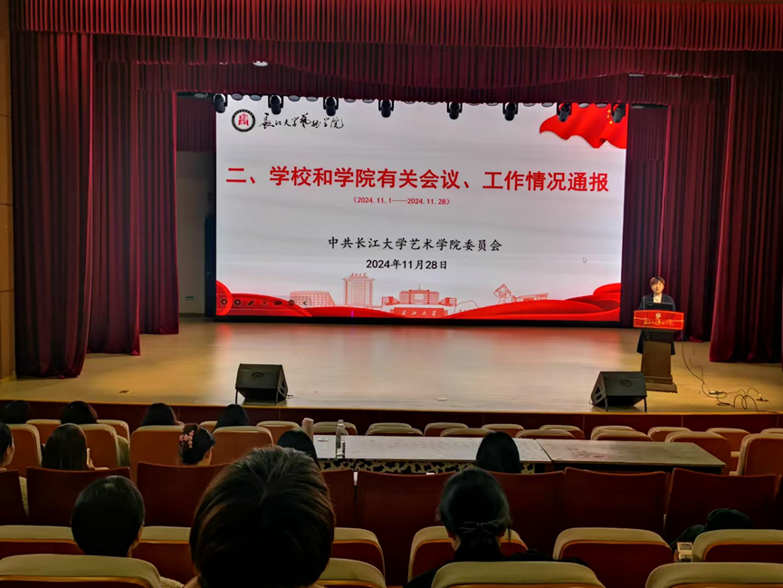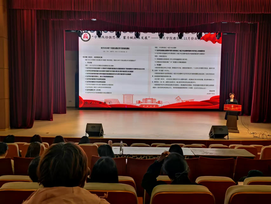 党委书记马小佼向全院教职工传达了近期学校和学院的重要工作会议精神,通报了近期兄弟院校安全情况、意识形态案例和学院2024年意识形态工作情况,提醒老师们关注员工安全和动向。传达了党委第三巡察组对学院巡察立行立改的问题。随后带领全体教职工开展十一月份政治理论学习,学习了《习近平在中共中央政治局第十七次集体学习时强调:锚定建成文化强国战略目标 不断发展新时代中国特色社会主义文化》《习近平在甘肃考察时强调:深化改革勇于创新苦干实干富民兴陇 奋力谱写中国式现代化甘肃篇章》《习近平在安徽考察时强调:发挥多重国家发展战略叠加优势 奋力谱写中国式现代化安徽篇章》《习近平给中国科学院院士、清华大学教授姚期智的回信》《习近平给中国传媒大学全体师生的回信》《习近平给中国海洋大学全体师生的回信》《习近平论教育工作(2024年)》《习近平在省部级主要领导干部学习贯彻党的二十届三中全会精神专题研讨班开班式上发表重要讲话》,重点学习了《习近平在湖北考察时强调:鼓足干劲奋发进取 久久为功善作善成 奋力谱写中国式现代化湖北篇章》。