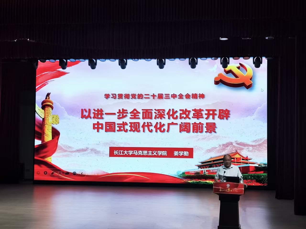 姜学勤教授围绕《以进一步全面深化改革开辟中国式现代化广阔前景》为题作专题辅导报告。会上,姜学勤教授从全会的筹备过程,全会的主题和新时代全面深化改革的重大成就,进一步全面深化改革、推进中国式现代化的重大意义和总体要求,进一步全面深化改革的系统部署,提高党对进一步全面深化改革、推进中国式现代化的领导水平等五个方面,系统阐述了党的二十届三中全会精神。报告内容详实、案例丰富、讲解精辟,既有理论高度,又紧密联系工作实际,让与会教职工更好地理解和把握全会精神的核心要义和实践要求。
