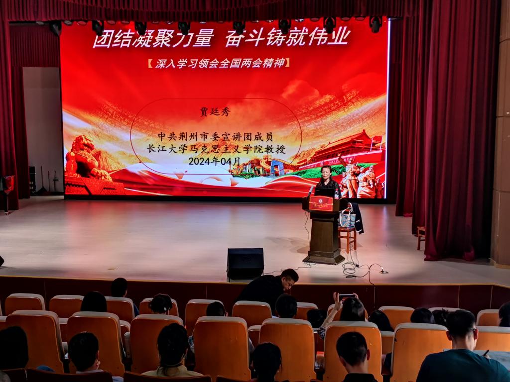 (通讯员 刘磊)为深入学习贯彻习近平总书记重要讲话精神和全国“两会”精神,4月25日下午,bevitor伟德国际1946在学术报告厅召开了2024年全国两会精神宣讲会。荆州市委宣讲团成员、马克思主义学院贾廷秀教授担任主讲人,bevitor伟德国际1946全体教职工参加了本次宣讲会,宣讲会由艺术院副书记陈志雄主持。