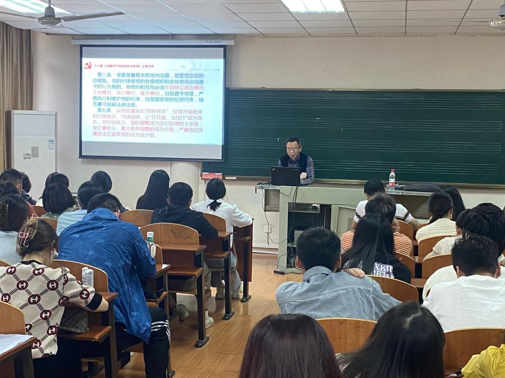 为进一步强化全院师生党员的纪法意识,推进党风廉政宣教月活动走深走心走实。9月22日,学院邀请学校纪委、监察专员办公室纪检监察员朱光耀同志为学院全体党员开展纪法知识宣讲,以“讲政治,守规矩,做合格共产党员”为题对《中国共产党纪律处分条例》进行了解读。