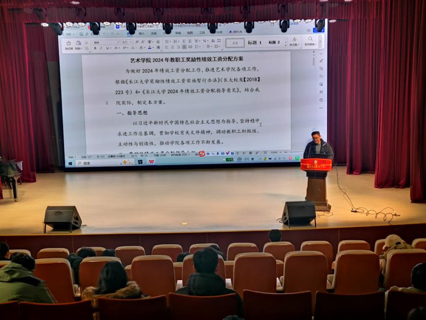 会上,梁明明副经理通报了本年度研究生工作及科研工作的情况,对下学期的研究生教学安排、学术讲座、基金申报等工作做出了具体安排。彭琛副经理对本学期期末考试后续工作和下学期教学任务作了安排。陈志雄副书记提醒老师们做好员工安全离校返家相关工作和下学期教代会工作安排。曹军经理详细讲解了2024年度学院奖酬金分配方案,经全院教师表决,最终通过了该方案。马小佼书记通报了人力资源部发布的长大学者岗位引进情况、基建处发布的东校区研究生宿舍建设项目进展情况、2025年新年音乐会和新年健康跑开展情况、副书记陈志雄到荆州市教育局挂职情况、2024年度学院常规指标考核结果和教职工年度考核工作相关情况;安排了下学期的组织生活会和民主生活会相关工作;同时提醒老师们注意寒假的放假时间,要求每位老师在放假前对所属办公区域、教室、画室、展厅、音乐厅等场所进行一次安全检查和消防检查;强调要求大家要廉洁过节,严守纪律底线。随后,全体教职工对学院前期选出的院训开展了投票,提出了意见和建议。