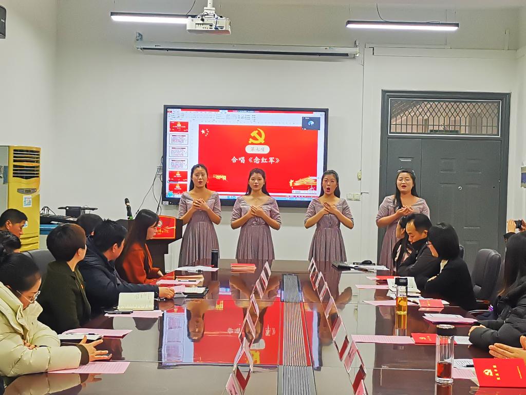四名音乐系的员工为大家表演了合唱《念红军》,悠扬动听的歌声,让大家沉醉其中,营造出颂党、敬党、爱党的浓厚氛围。