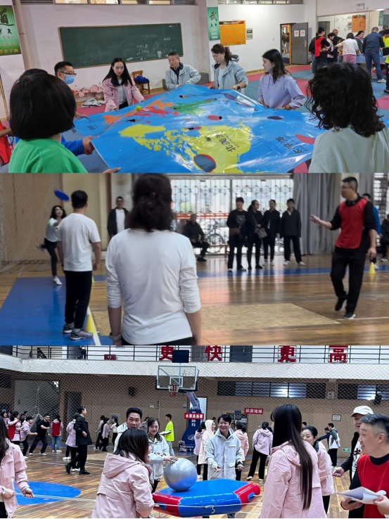 教职工趣味运动会在千名师生共同齐做《第九套广播体操》和文体表演后正式拉开序幕。比赛设置“与时俱进”、“水果连连看 ”、“飞盘九宫格”、“玩转飞盘”、“环游地球”、“鼓动人心”六个团队项目,以累计积分排名次。