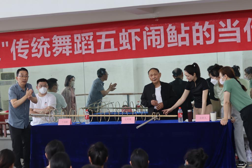 此次活动主要分为历史溯源、传统套路展示与教学三部分。在讲座中,毛明康和丁功顺两位老师向大家逐一介绍了荆州传统灯舞“五虾闹鲇”的历史文化与民间风俗、“五虾闹鲇”的道具制作方法以及示范教学“五虾闹鲇”的表演形式,让舞蹈系的师生们得以近距离了解非遗传统舞蹈文化的意蕴与魅力。