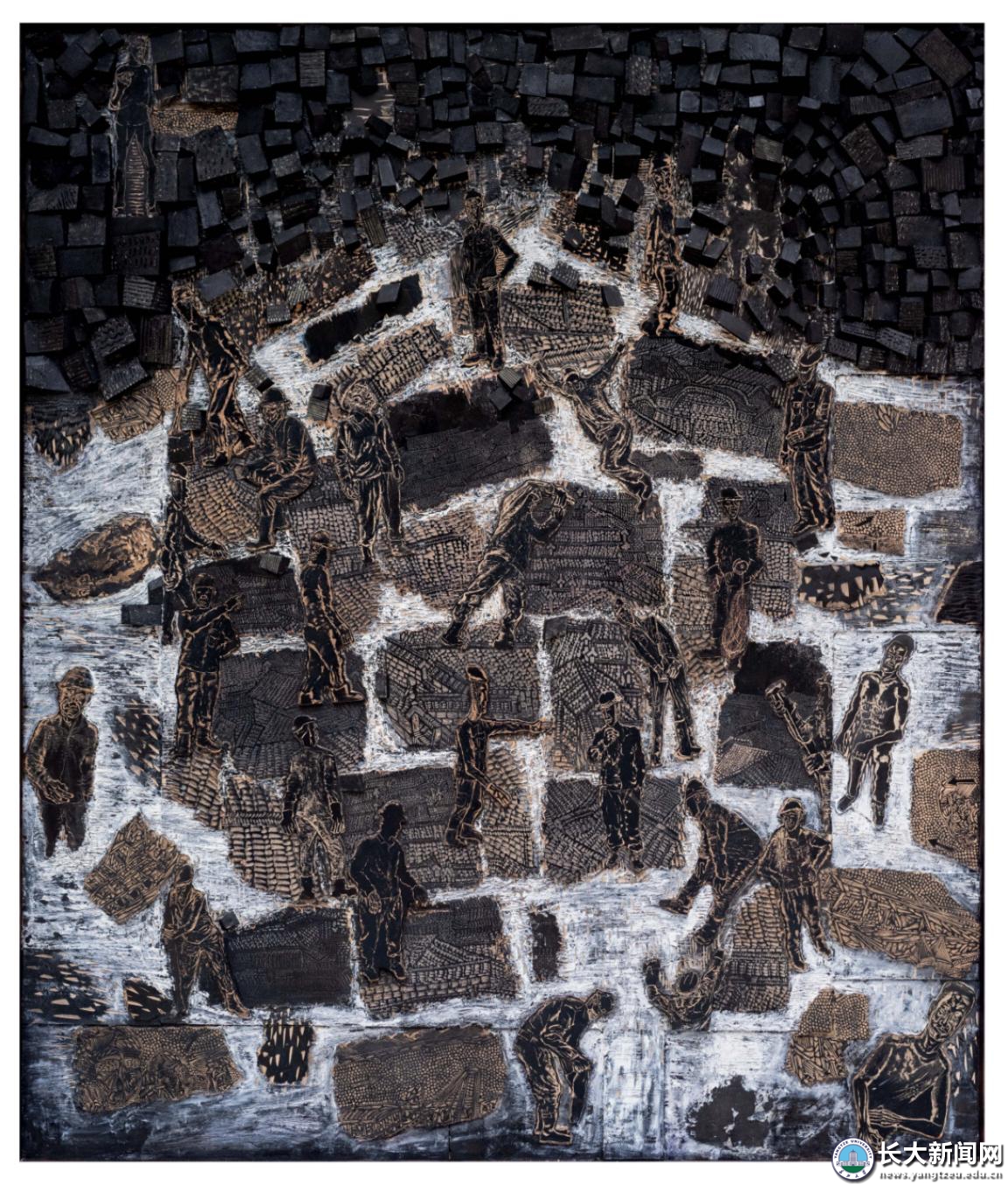 据介绍,该作品创作时耗两年,采用“舍”字形构图。阐述的是一群默默无闻的“劳动者”在夜以继日的进行生产作业。材料的运用是该作的一大亮点,含括了木头、泡沫块、塑型膏、油彩等材质,制作出了类似浅浮雕似的立体效果。