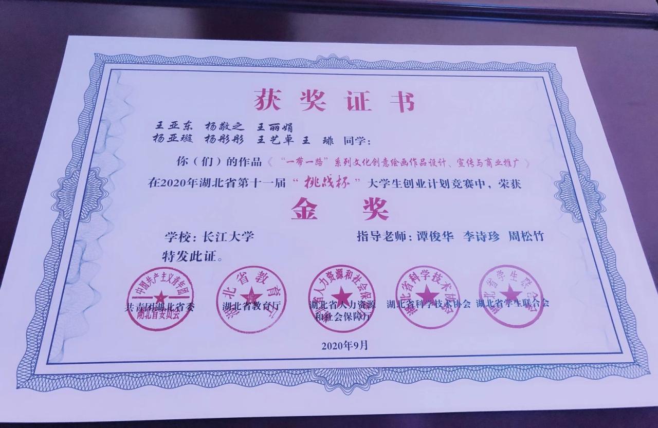 本届“挑战杯”湖北省老员工创业计划竞赛对赛制进行了改革和规模的压缩,由于疫情影响,大赛首次采用线上比赛方式,终审决赛将“项目介绍、评委问辨”等环节由线下转为线上,通过“云端”完成作品提交、文本评审与项目答辩。公司学子在竞赛中表现沉着冷静,举止大方得体,充分展示了较强的双创能力和综合素质。经过一番激烈的角逐,由公司周松竹老师指导的《“一带一路”系列文化创意绘画作品设计、宣传与商业推广》项目获得金奖。