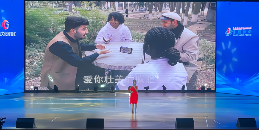 应市委统战部邀请,bevitor伟德国际1946教师傅小草携音表12401员工邱娜以及国际员工茜卡在主题展示环节演绎了原创MV《讲好中国故事——我爱这辽阔的地方》。邱娜扮演着中国语言、中国故事的传播者,她逐字逐句地教非洲女孩汉字,给她讲中国故事,教她唱中国歌。