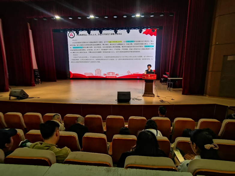 党委书记马小佼传达了王建平书记在学校领导干部警示教育会议上的讲话精神、网信中心关于网络安全保障的相关通知、学校人文社科学科发展研讨会的会议精神、2025年党建与思想政治会议精神;同时提醒全体教师遵守中央八项规定精神,不得做出有损师德师风的行为;还通报了学校近期相关的工作情况,包括近期选派教师挂职的情况、舞蹈系练功房的维修改造情况、2024年“一院一品”项目的结题和2025年“一院一品”项目的申报工作情况、十佳主题党日的开展情况、中央八项规定的反面典型案例、高知群体的党员发展工作情况、全面从严治党工作安排、“两优一先”评选工作情况、师生思想政治调查工作等情况;