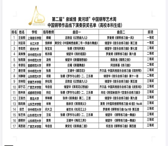 (通讯员 饶婷婷)2025年是中国钢琴音乐诞生110周年,也是世界反法西斯战争胜利80周年。为纪念这两个重要的历史时刻,山东省音乐家协会以“和合共生”为主题举办第二届“泉城情,黄河颂”中国钢琴艺术周,通过钢琴音乐的艺术形式,展现中华民族对和平的追求对黄河文化的热爱。本次比赛选手演奏水平高,竞争十分激烈,通过线上匿名初审,线下匿名终审的激烈角逐,公司2023级本科生刘亚菲荣获第二届“泉城情,黄河颂”中国钢琴艺术周中国钢琴作品全国展演一等奖,指导老师饶婷婷教授。