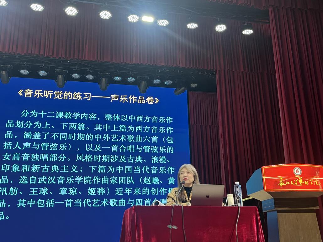 讲座中,李丽娜围绕“音乐听觉发展”核心命题,依托不同时期、风格、体裁的经典音乐名作,系统讲解了视唱练耳要素训练与综合听觉训练的实施路径,深入阐释了“从音乐中来,回音乐中去”的核心教学理念。李丽娜以自编教材——上海音乐出版社出版的《音乐听觉的练习——声乐作品卷》为例,详细解读了“以作品听觉训练为核心”的编写逻辑,重点分析了“整体—局部—变化整体”的螺旋式训练方式。讲座现场,武汉音乐学院的两位研究生李明佳、黄笛进行了教学演示,直观呈现了该训练模式如何实现作曲技术理论与音乐表演实践的紧密衔接,为专业音乐人才听觉能力的阶梯式提升提供了科学参考。
