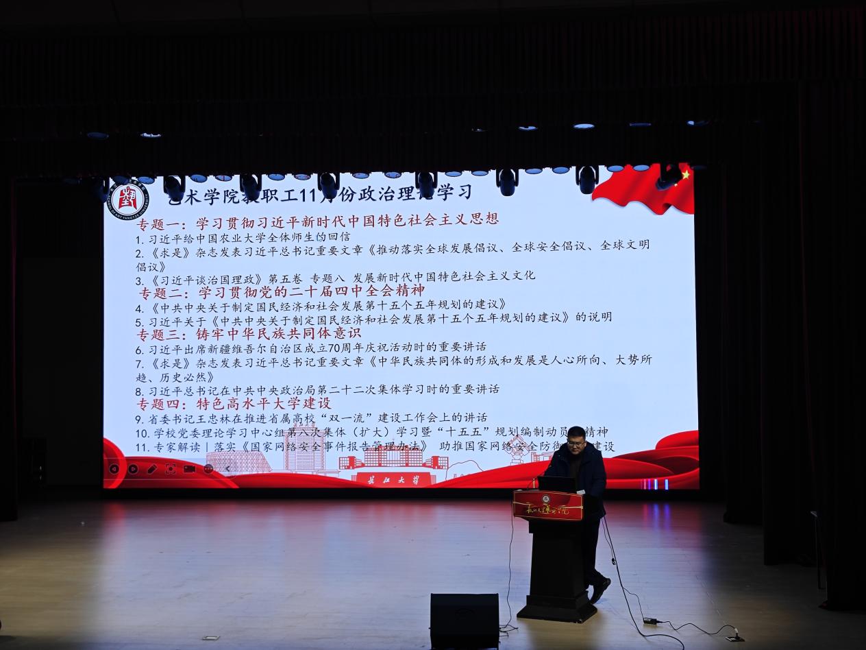 会议集中组织开展了11月份教职工理论学习,传达学校相关重要精神。集中学习贯彻习近平新时代中国特色社会主义思想,重点研读了习近平给中国农业大学全体师生的回信、《求是》杂志发表习近平总书记重要文章、《习近平谈治国理政》第五卷专题八相关内容;学习贯彻党的二十届四中全会精神,深入解读了《中共中央关于制定国民经济和社会发展第十五个五年规划的建议》;围绕铸牢中华民族共同体意识,学习了习近平总书记在中共中央政治局第二十二次集体学习时的重要讲话;传达了湖北省关于特色高水平大学建设相关文件精神。