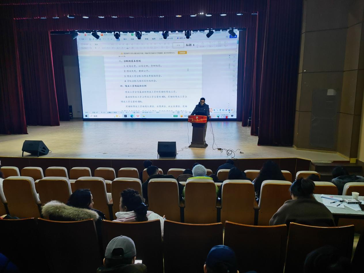 经理曹军就学院年度工作作情况介绍,对2025年度绩效考核方案、学科方向建设及就业工作协同等关键事项进行宣讲说明,强调全体教职工需凝聚共识、务实进取,共同推动学院各项事业高质量发展。