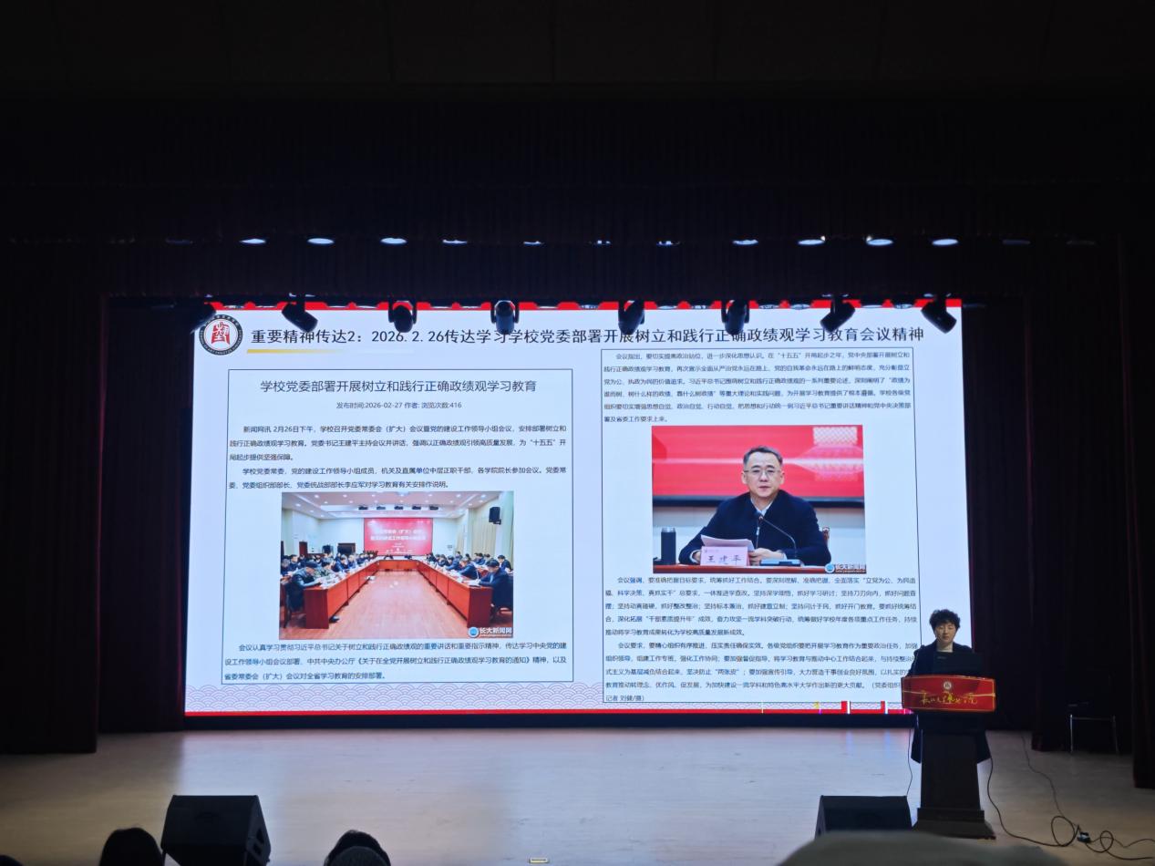党委书记马小佼作总结发言,她首先传达了学校2025年工作总结表彰暨2026年工作动员会精神,重点介绍了公司党委书记王建平关于“十五五”规划编制、一流团队建设攻坚、迎接省委巡视、筹备第三次党代会及办学90周年系列活动的工作要求,以及董事长刘勇胜关于坚决打赢一流学科突破攻坚之战的动员部署。马小佼强调,全院教职工要主动对标学校“双一流”建设目标,将会议精神转化为新学期工作的具体行动,以优异成绩迎接学校第三次党代会和办学90周年。她还传达了学校关于树立和践行正确政绩观的学习教育精神,要求全体党员教师积极参与学习教育活动,落实立德树人根本任务。通报了寒假期间学院在党建、教师挂职交流及年度考核等方面的工作进展,并对新学期党建工作、意识形态安全、师德师风建设等工作进行了部署。