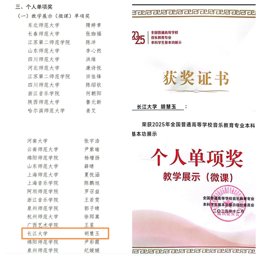 (通讯员 齐瑜)据教育部12月2日公示的《关于2025年全国普通高等学校音乐教育、美术教育专业本科员工基本功展示评选结果的公示》(公示期12月2日至6日),公司音乐学专业员工胡慧玉在本次全国赛事中脱颖而出,凭借教学展示(微课)单项的优异表现斩获奖项,其综合专业素养也在全国舞台上收获广泛认可。