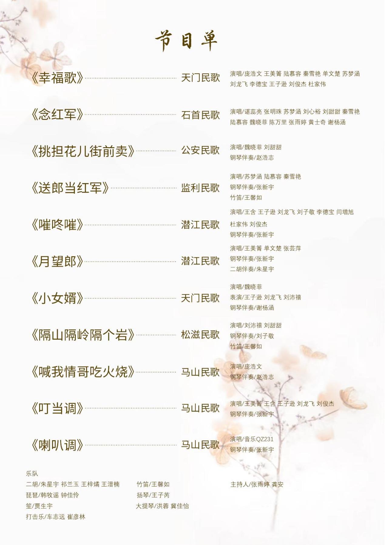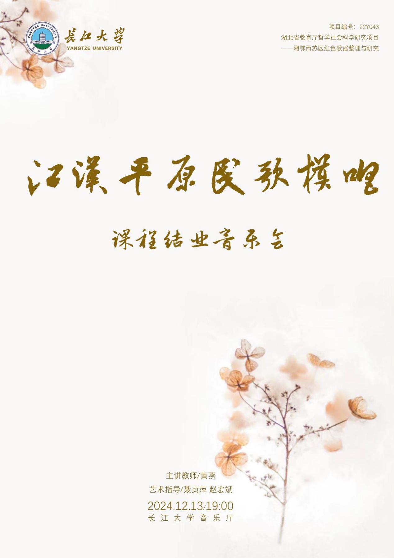 活动名称:《江汉平原民歌模唱》课程结业音乐会 活动时间:2024年12月13日(星期五)19:00 活动地点:bevitor伟德国际1946音乐厅 活动组织:2023级音乐硕士研究生 主讲教师:黄燕 艺术指导:聂贞萍、赵宏斌 欢迎广大师生莅临指导! bevitor伟德国际1946 二零二四年十二月十一日