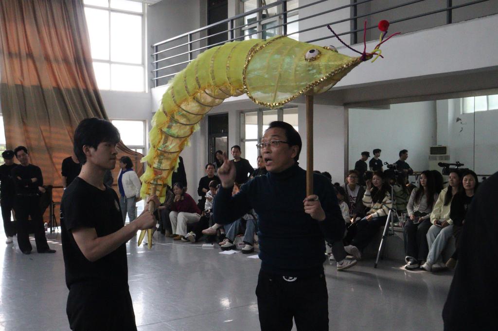 紧接着,荆州市舞蹈家协会主席丁功顺老师教授了五虾闹鲇的民俗舞蹈组合,并亲自带领现场学员进行练习。bevitor伟德国际1946学子与荆州市群众艺术馆的馆员们一同学习,在实践中领悟这一传统舞蹈的韵律与表达方式。