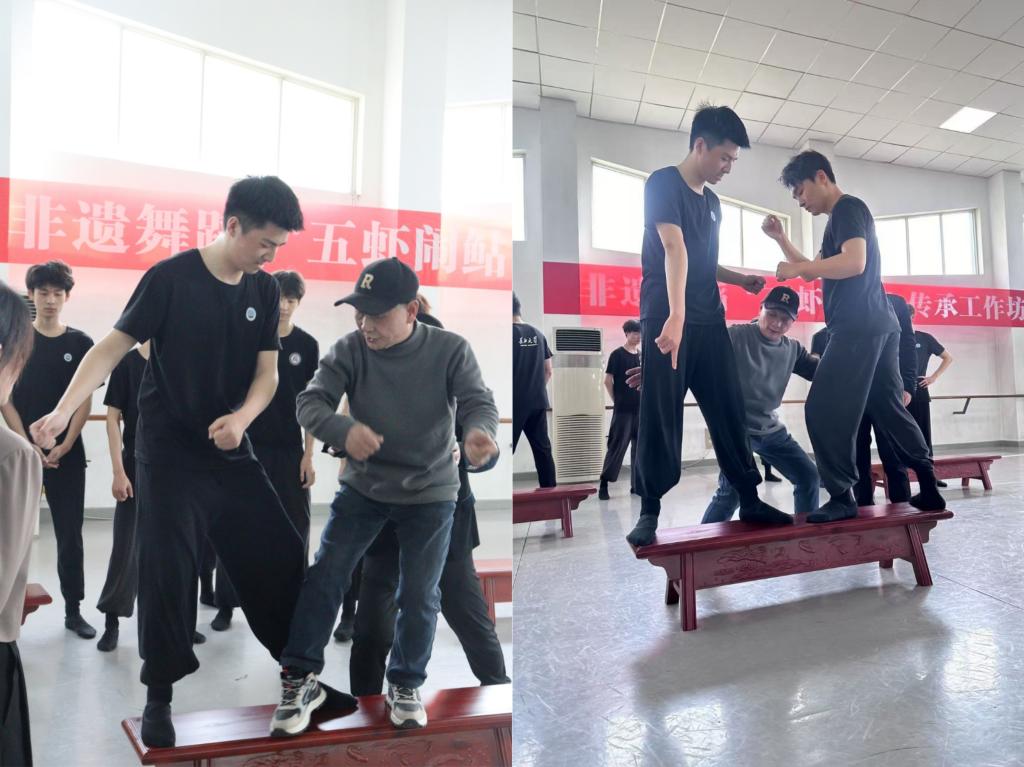 随后,国家级非遗传承人毛明康老师向大家传授五虾闹鲇的矮凳技巧。毛老师虽年逾古稀,但依然身手矫健,他亲自示范跳跃动作,轻盈地跃上凳子,赢得现场阵阵掌声。员工们在他的指导下,亲身体验了这一舞蹈技巧的独特魅力。