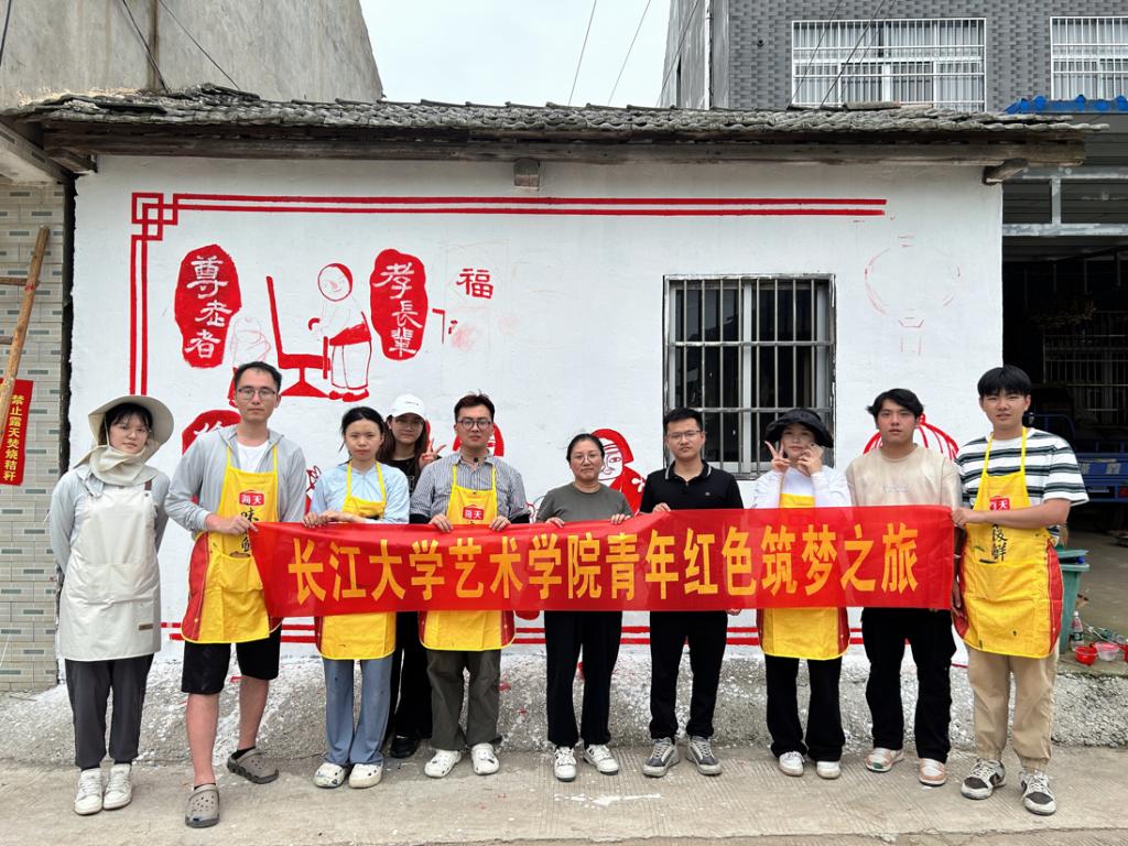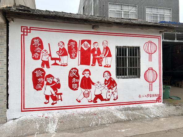 乡村振兴既要塑形,也要铸魂。艺术是一条润泽心灵、涵养乡风的河流。团队“提升乡村美育文化”作为一项重要工作内容,并组织师生共9人前往监利市程集镇堤头村开展为期三天的“青春振兴,绽放“艺”彩”对口帮扶工作,无偿为堤头村绘制了4幅共计约420平方米的墙绘作品,与村民面对面,了解村名对理想生活的愿景,用画笔呈现堤头村特色的墙绘作品。