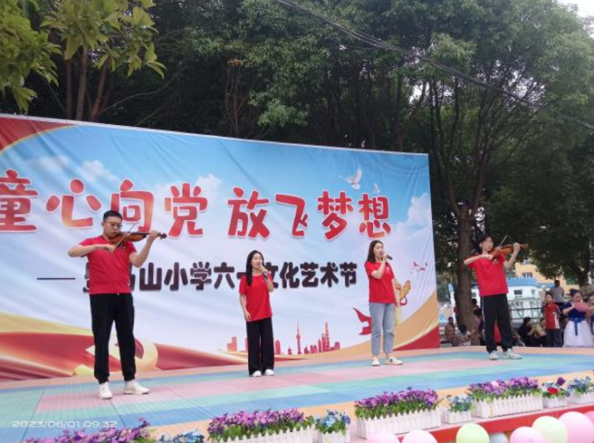 音乐系邹敏老师带领4名员工,来到荆州区马山镇马山小学参加“童心向党,放飞梦想”六一文化节。优美嘹亮的歌声伴着小提琴悠扬的旋律,沁入小朋友心田,让他们感受到了音乐与器乐相碰撞的回响。
