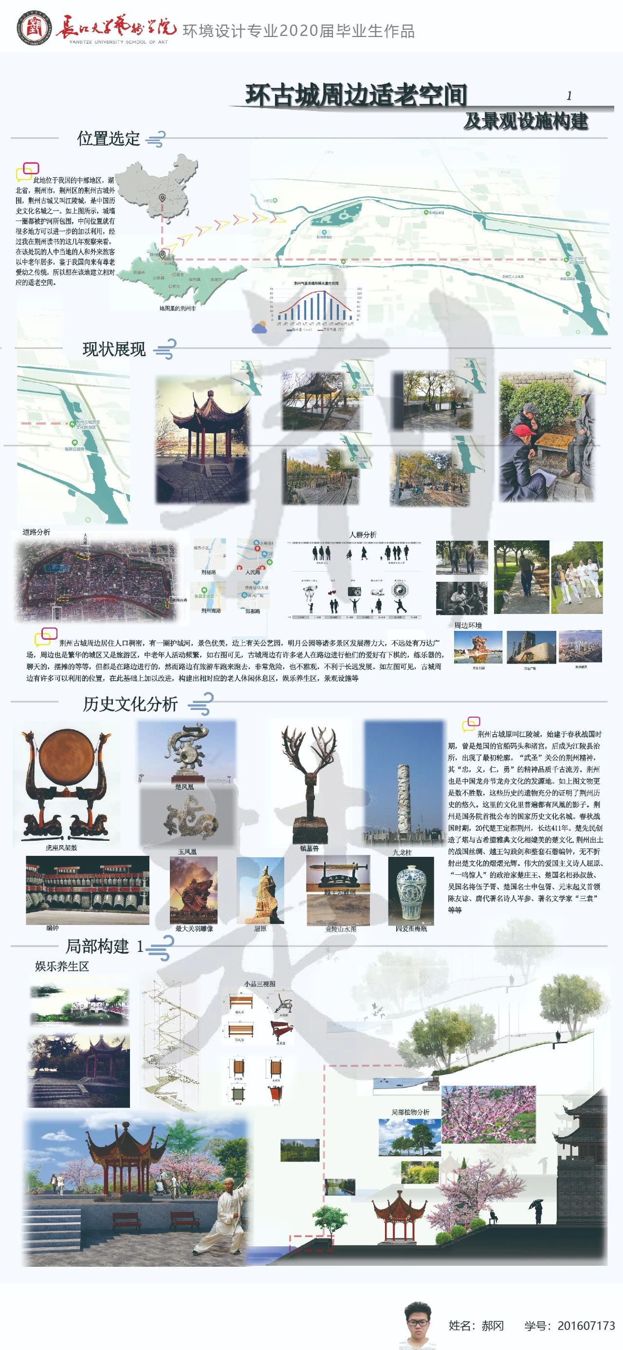设计说明:当代社会各个国家人口老龄化严重,各个国家各个地方都有很多的老人,儿女都为生活在外忙碌,有自己独自在家的,有住在养老院的,有老伴早去非常孤独的等等,社会上的老年设施还能改进,就荆州古城周边为例子,就有许多地方可以改进,在需要的地方我们可以建立娱乐养生区,休闲休息区等等。用以改进老人活动条件。