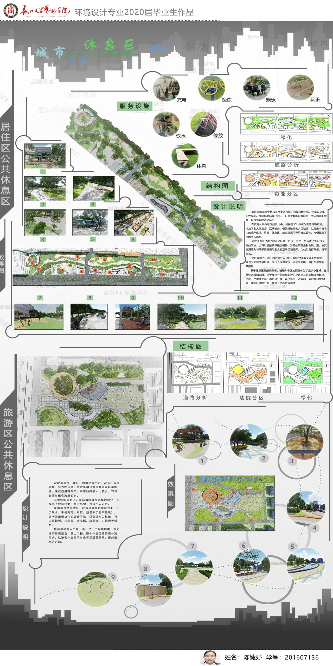 设计说明:城市公园是每座城市必不可少的公共场所,每个公园又有它独特的意义所在,处理好公园环境与人群的关系更有利于促进公园的发展与完善,让公园成为人们健康和娱乐休闲服务的场所,让人们的休闲娱乐活动更加的丰富多彩,让公园因为人们的加入更加的富有生机与活力,为城市的绿色发展人们的健康生活贡献力量。