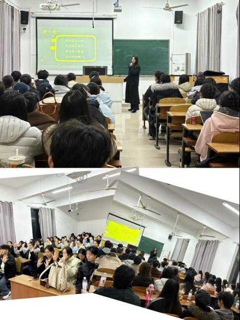 接着,邓玉轩以公开课的形式向大家展示了她在实习过程中的教学收获,通过猜谜、动画、手势舞等形式将音乐与舞蹈融合教学。其精心设计的课堂环节既体现了教学巧思,又充分调动了参与感,不仅展现了优质课堂的构建逻辑,更成功点燃了在场23级员工的学习兴趣,为他们提供了可借鉴的课堂设计思路。