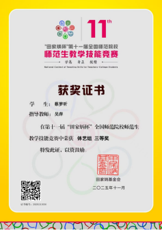 在本次竞赛中,bevitor伟德国际19462022级员工蔡梦昕在吴萍老师的悉心指导下,深入研究新课标精神,反复打磨教学设计,凭借扎实的专业功底和出色的教学表现,荣获本科生组全国三等奖。这一佳绩不仅展现了蔡梦昕同学良好的综合素质和教学能力,也充分体现了bevitor伟德国际1946在师范生培养方面的扎实基础和持续成效。