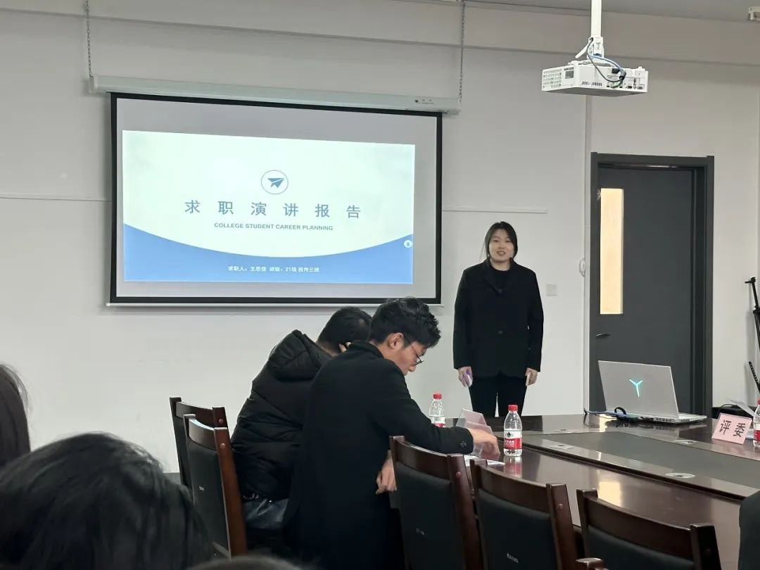 这次模拟大赛共分为四个流程。首先由求职者进行个人介绍和展示个人风采;其次求职者通过ppt讲解自己的对岗位的认知与理解;再次,选手进行现场抽题的方式进行结构化面试;最后,由面试老师对求职者进行现场提问。经过求职者的刻苦努力与赛前的充分准备,求职者们在现场上都展现了自己的对职位的看法理解与自己的优势。最终美术学12001班江文斌同学以93分排名第一,美术学1202班谢思同学以91.3分排名第二。
